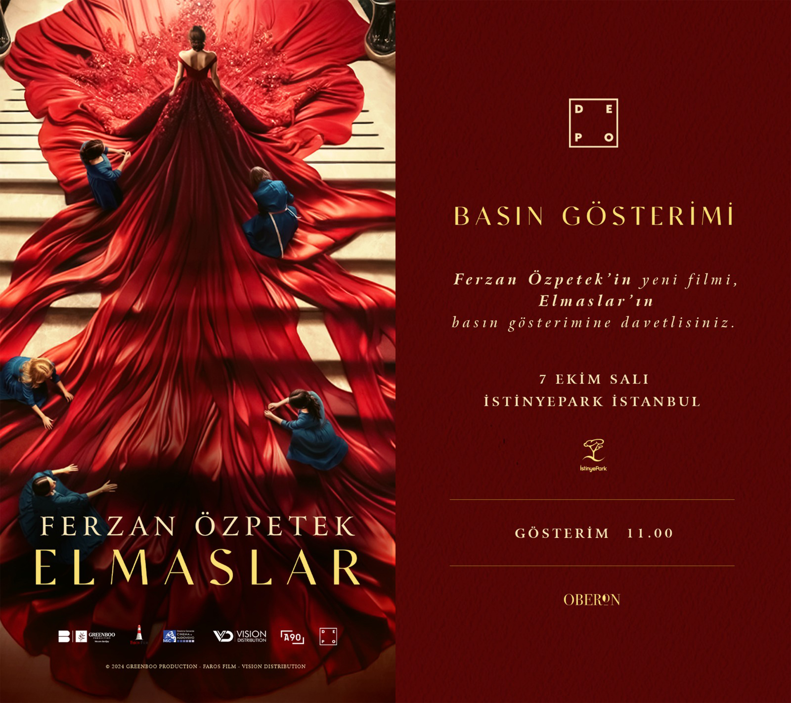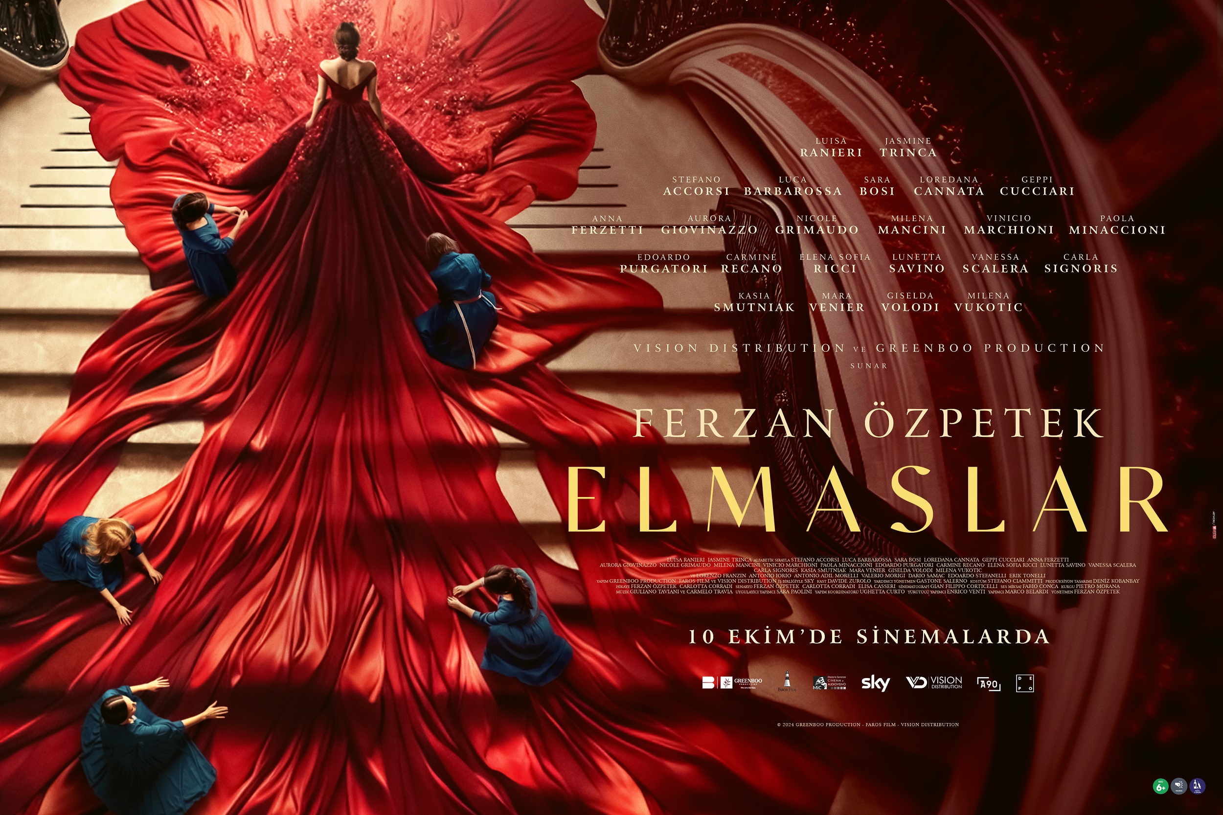 Ferzan Özpetek’in yönettiği ve Stefano Accorsi, Luca Barbarossa, Sara Bosi ile Loredana Cannata’nın oynadığı Elmaslar (Diamanti), 10 Ekim 2025’de A90 Pictures dağıtımıyla Depo Film tarafından vizyona çıkarıldı.