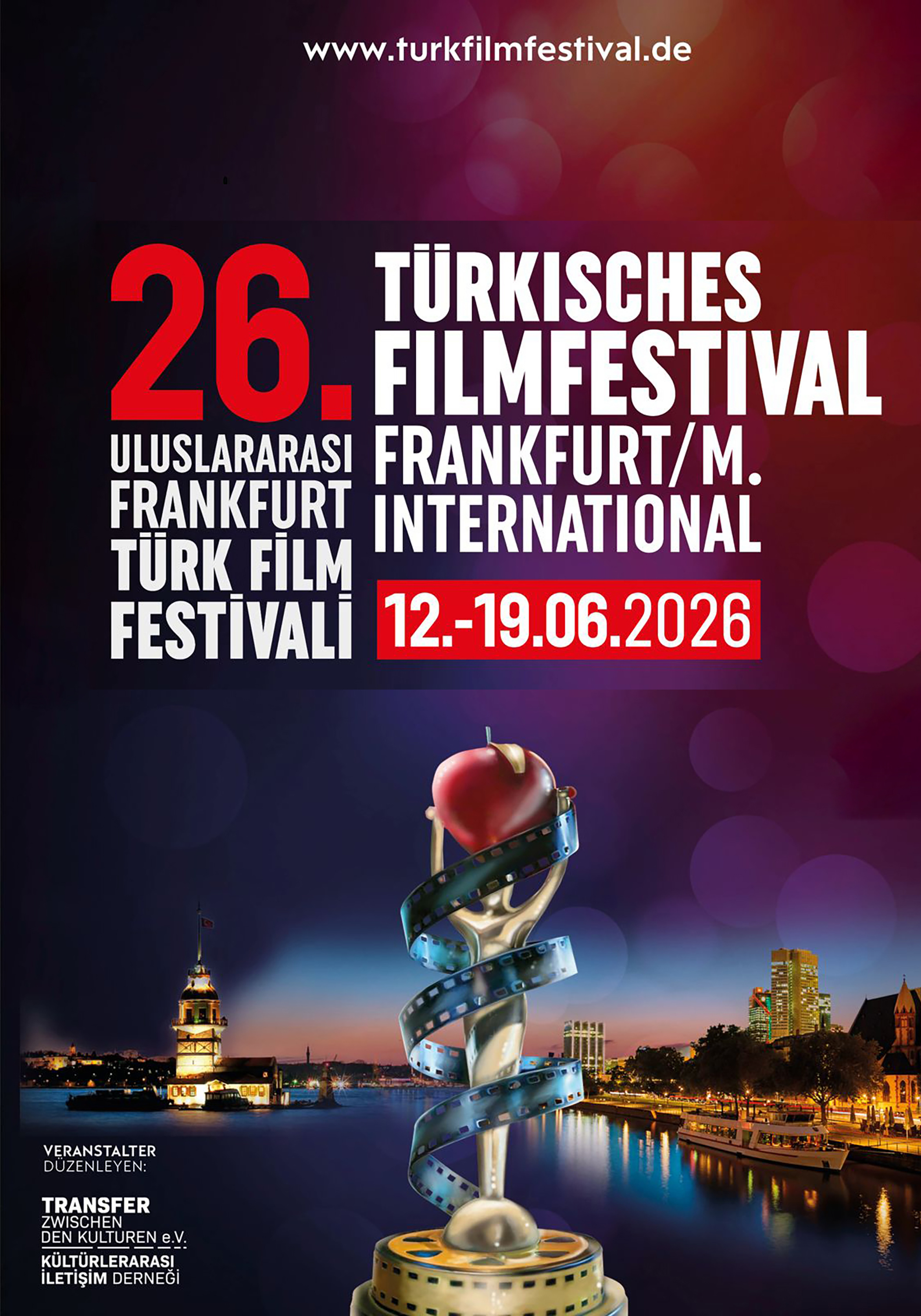 26. Uluslararası Frankfurt Türk Film Festivali (26. Türkisches Filmfestival Frankfurt/M. International) bu yıl, 12 – 19 Haziran 2026 tarihleri arasında düzenlenecek ve ödüller 19 Haziran 2026 Cuma gecesi sahiplerine takdim edilecek. Festival kapsamında Alman Sinemacılar Gözü ile Türk Filmleri Ulusal Uzun Metraj Film Yarışması, Belgesel Film Yarışması, Türk – Alman Üniversitelerarası Kısa Film Yarışması gerçekleştirilecek. Uluslararası Frankfurt Türk Film Festivali, sürekli artan izleyicisi, ilgili kitle sayısı, sürekli gelişen festival programı ve belli bir standarda ulaşmış kültürel gücü ile Türk Film sektöründeki gelişmeleri en uygun şekilde kamuoyuna yansıtıyor.
