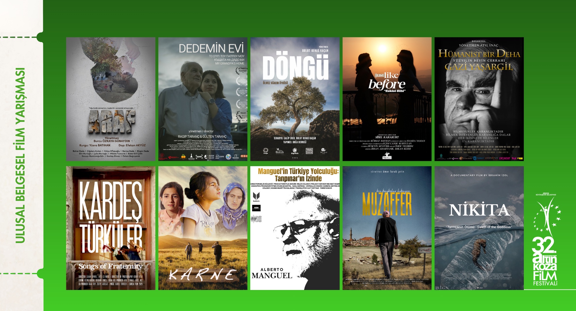 23 – 28 Eylül 2025 tarihlerinde yapılacak 32. Uluslararası Adana Altın Koza Film Festivali’nin Ulusal Belgesel Film Yarışması’nın finalistleri belli oldu. 65 başvurunun gerçekleştiği yarışmada bu yıl, 7’si dünya prömiyeri olmak üzere toplam 10 film yarışacak. Belgesel Yarışması filmleri sinema yazarı Burçin Yalçın, akademisyen Meltem Cemiloğlu ile yazar Necla Algan’dan oluşan Seçici Kurul tarafından seçildi.