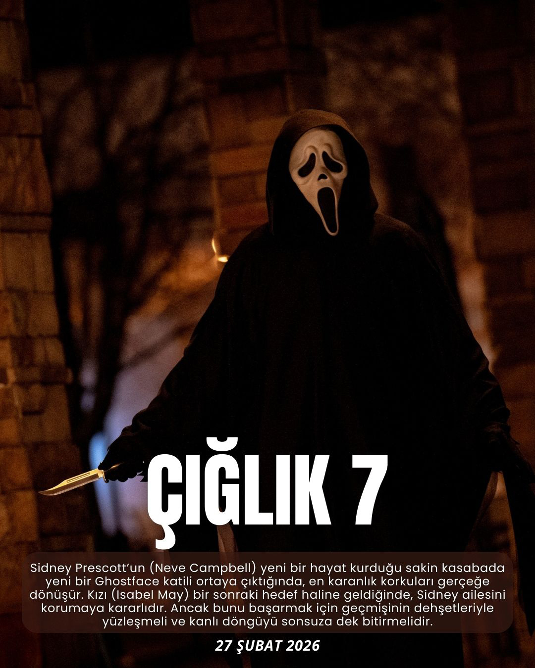 Kevin Williamson’un yönettiği ve Neve Campbell, Courteney Cox, Isabel May, Jasmin Savoy Brown, Mason Gooding, Anna Camp, Joel McHale, Mckenna Grace, Michelle Randolph, Jimmy Tatro ile Asa Germann’ın oynadığı Çığlık 7 (Scream 7), 27 Şubat 2026’da UIP Filmcilik dağıtımıyla Paramount Pictures tarafından vizyona çıkarıldı.
