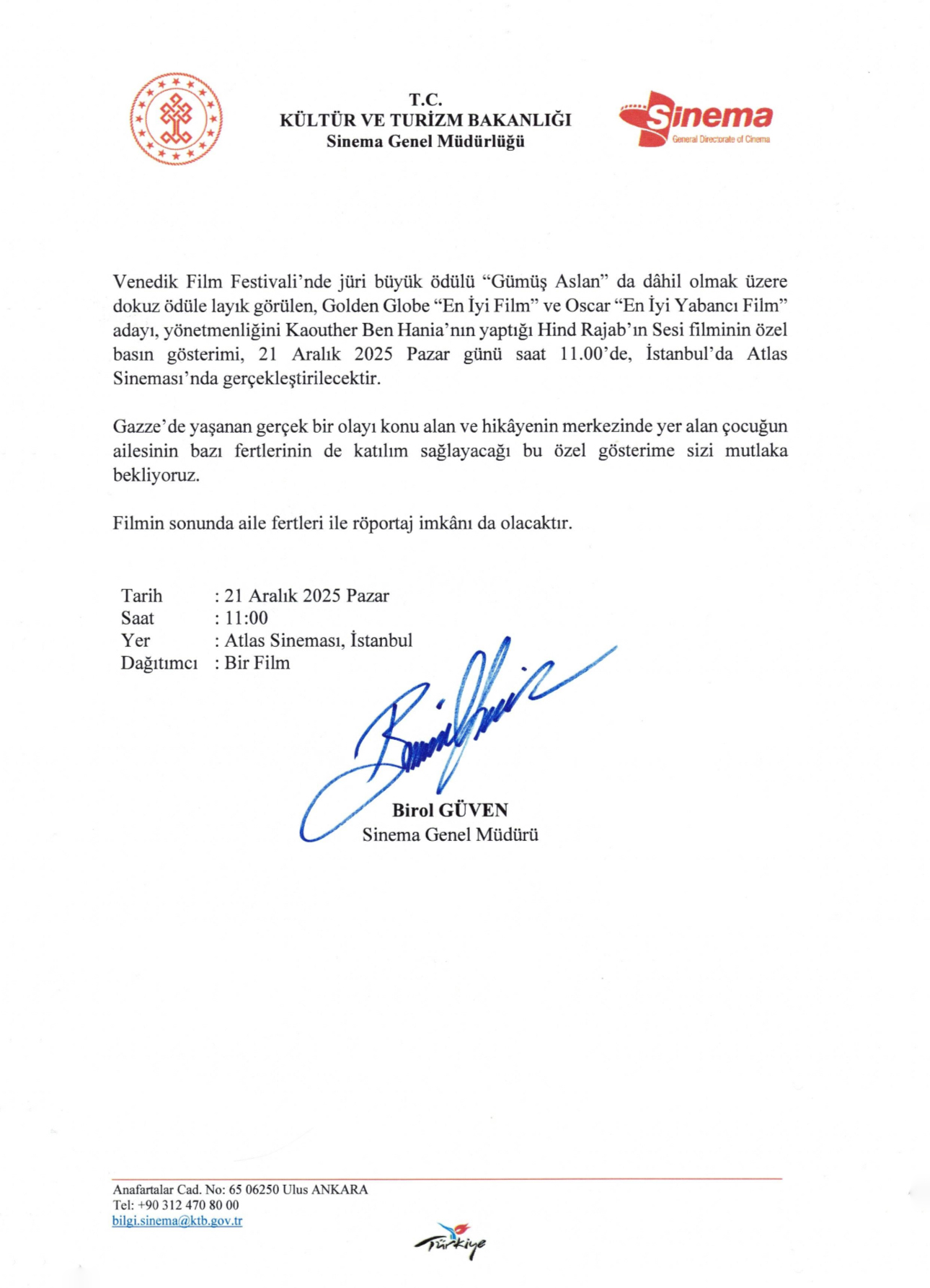 Kaouther Ben Hania’nın yönettiği ve Motaz Malhees, Saja Kilani, Clara Khoury ile Amer Hlehel’in oynadığı Hind Rajab’ın Sesi (The Voice of Hind Rajab), 19 Aralık 2025’de Bir Film dağıtımıyla Bir Film tarafından vizyona çıkarıldı.