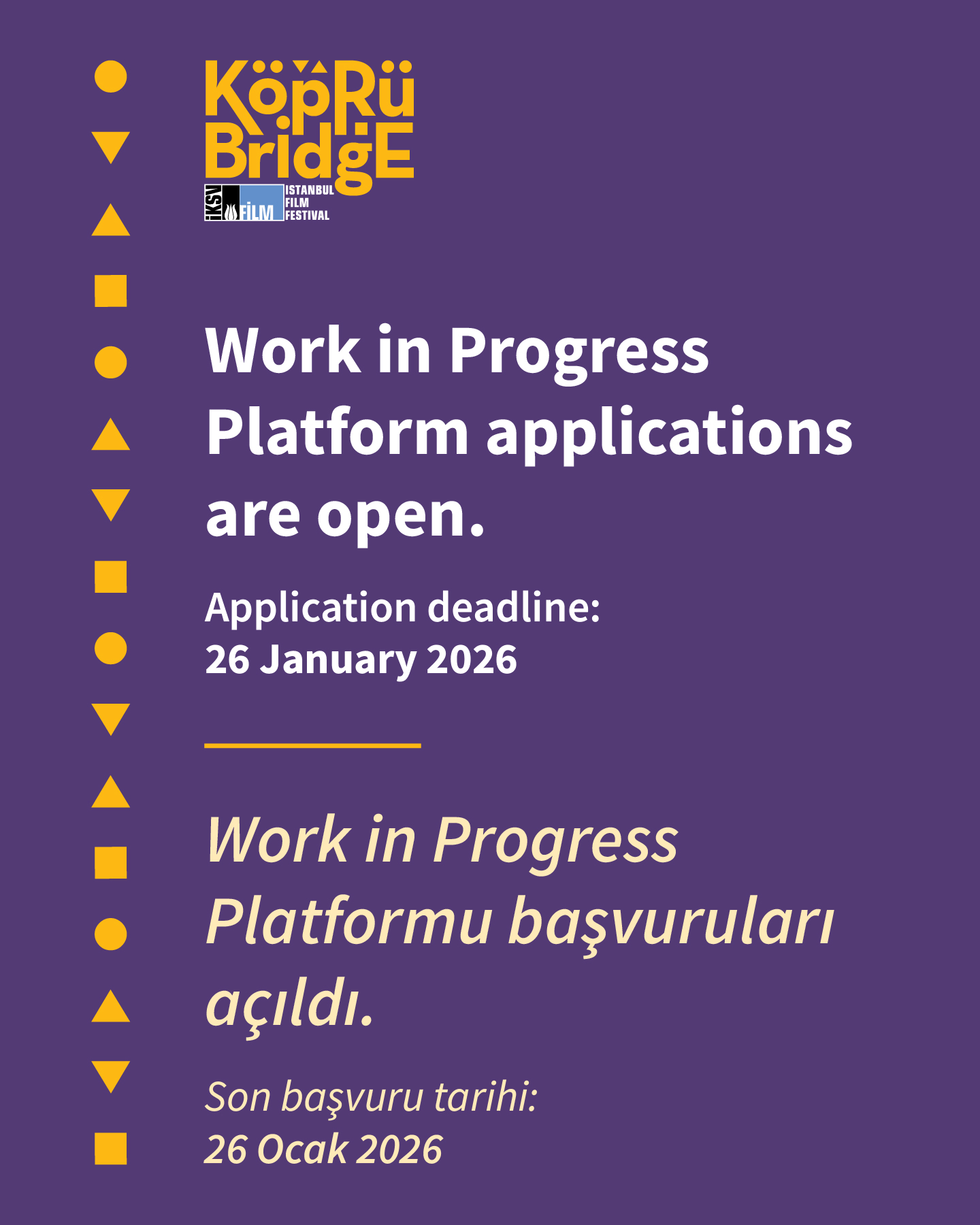 14 – 16 Nisan 2026 tarihleri arasında gerçekleştirilecek 21. Köprüde Buluşmalar’ın Work in Progress Platformu başvuruları açıldı. Anadolu Efes’in ana destekçisi olduğu 21. Köprüde Buluşmalar Work in Progress Platformu, çekimlerinde son aşamaya gelinen veya post prodüksiyon süreci devam eden Türkiye’den filmleri, uluslararası satış ajansı temsilcileri ve film festivali programcılarıyla buluşturuyor. Platforma, çekimlerinin en az % 70’i tamamlanmış ya da post-prodüksiyon aşamasındaki uzun metraj kurmaca veya belgesel film projeleri başvurabiliyor.